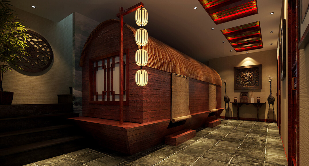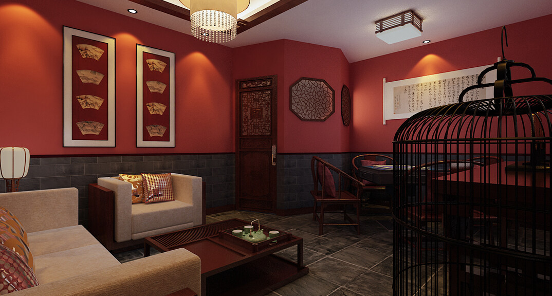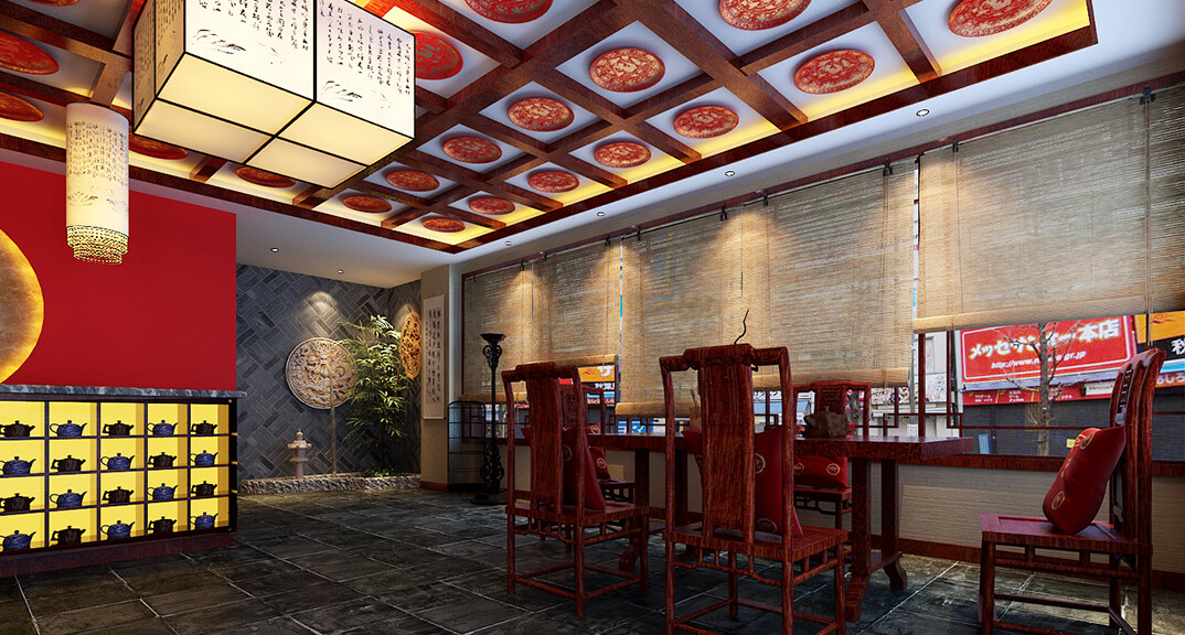 茶樓裝修200㎡茶室中式風格案例效果圖-夏紅