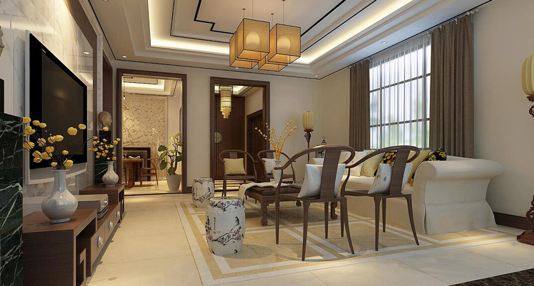 時(shí)代城318㎡別墅客廳新中式風(fēng)格裝修案例效果圖