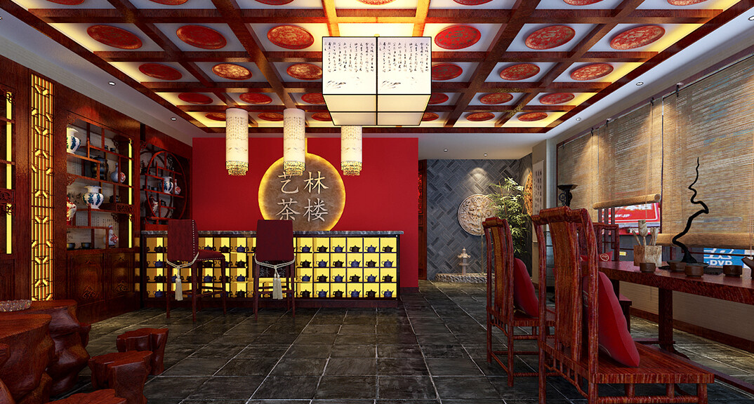 茶樓裝修200㎡茶室中式風格案例效果圖-夏紅