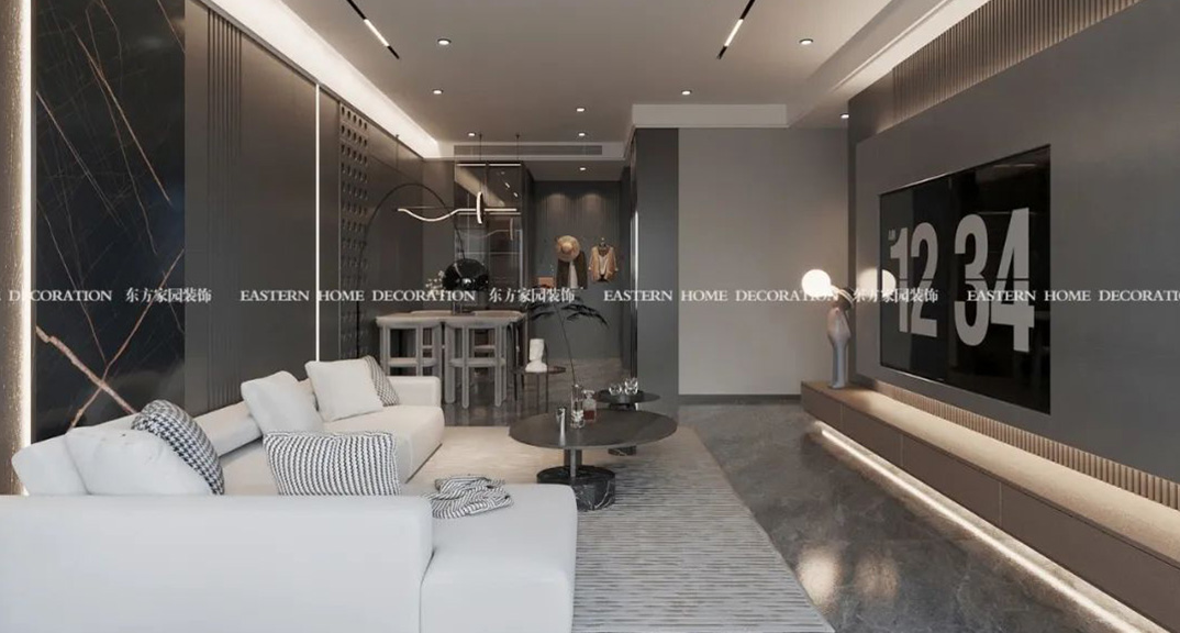 盛世華府129㎡三室兩廳客廳現(xiàn)代極致黑風(fēng)格裝修案例效果圖